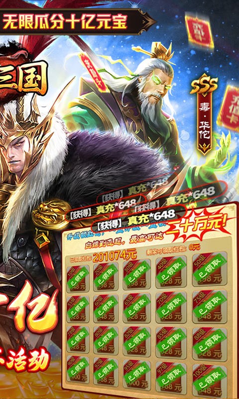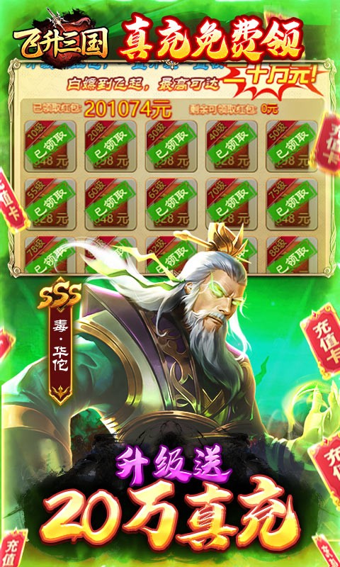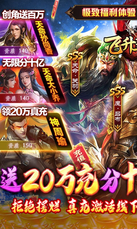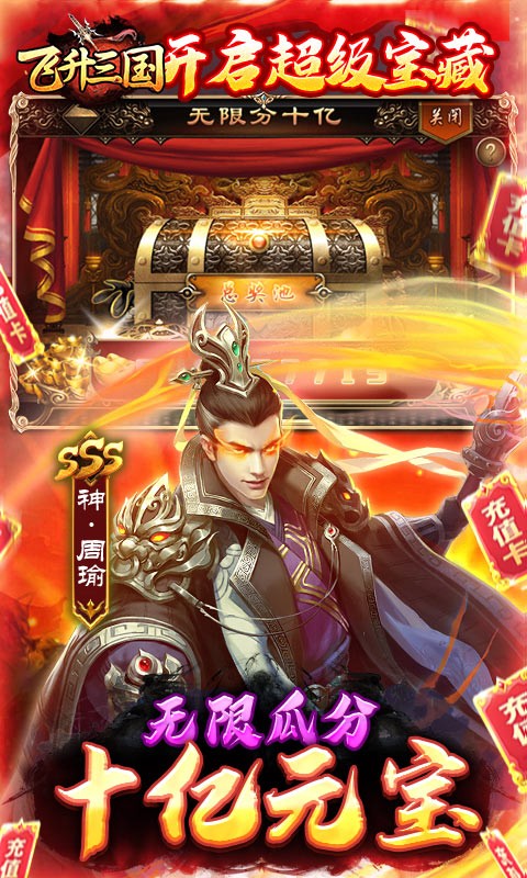 《飞升三国(送20万充分十亿)》经典三国携超强福利震撼回归,超高福利超爽战斗倍速,让你拥有不一样的游戏体验。升级领20万元真充,真充卡可激活线下永久累充活动,并且可以解锁全部GM商城!独创新玩法超级宝藏,免费瓜分百亿元宝,奖池不间断,无限瓜分百亿元宝!登录签到免费领取海量道具,领到最后应有尽有!玩家在游戏中化身为主公,招兵买马带领众多名将征战四方结交天下英雄,还有机会与当世美人结缘,一统天下功成名就。完美还原了三国战争场景,权谋战略之间的较量,风起云涌,号角吹响,率领大军参与国战,攻城略地,在战乱中建立自己的势力,定天下以安民心。