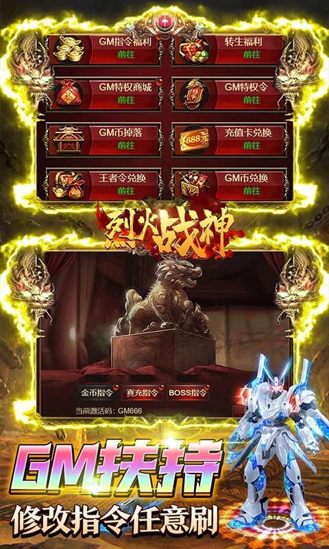 经典传奇,回味无穷!烈火战神全新版本携四职业王者归来!上线送vip15、100w元宝,绝版特效时装!全方位全地图真打金玩法,每天击杀boss可获得真充值!GM扶持功能,无限资源0氪任意领取!无限资源千倍返利,买断商城直接雷霆至尊升至满阶!内置GM指令,商城统统一元宝拿走!最强福利传奇,邀你来战!