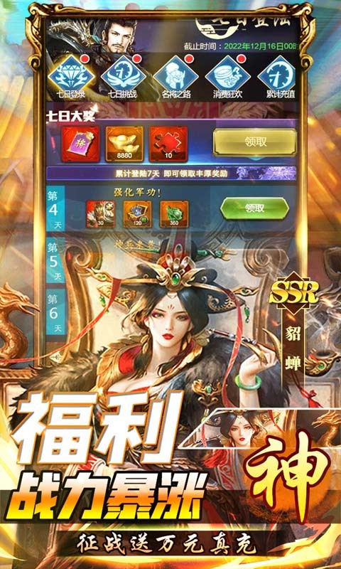 这是一款以三国题材背景,轻松又有策略的放置类卡牌游戏。游戏内所有三国名将几乎零门槛,三国名将轻松获取,合理搭配出自己所需的队伍,并利用奶追阵、暴追阵、晕追阵、毒追阵这类武将技能设定搭配。游戏内有各种各样的BOSS,轻松完虐,即可获得海量福利与顶级装备。尝试多种阵容组合挑战多样副本,彰显自身实力的绝对舞台!游戏中独特的放置玩法给你带来不一样的体验。