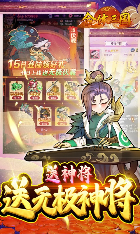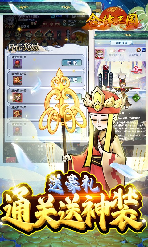 《合体三国》是一款以封神神话为背景的卡牌策略类手机网络游戏。在游戏中,以神话武将收集为主线,通过对武将的培养形成核心战斗力,从而逐步参与和突破其他的玩法。游戏玩法融入爬塔、日常副本等玩法,经典完美传承,历史策略卡牌情怀再续!通过玩游戏,玩家能获得经营策略思维的锻炼,体验胜利的乐趣。