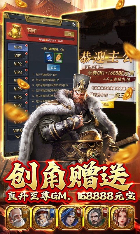 《骑战三国(送GM无限充值)》上线即送GM特权,168888元宝,千元充值卡,免费开启GM商城。游戏高度还原三国剧情,数十位武将,十八般兵器,骑上作战,谁与争锋。武侯八阵,天地风云,龙虎鸟蛇,应势而变。武将合体百技尽出,且看刘关张“桃园结义”,董吕貂“双星捧月”。神兵降世,青龙刀享誉四海,魔 画戟威震八方。董贼狼子野心,人神共愤,讨伐诸侯,势在必行。草船借箭,与孔明共勉;破铜雀塔,剑指曹操;过五关斩六将,奔赴四方,最终成就升官晋爵之路。