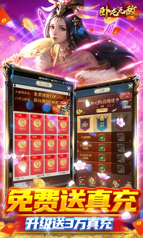 2023超受期待三国放置手游,多重好礼送不停,上线即送VIP10,海量仙玉元宝,千万铜钱,升级狂送30000真充,挂机爆真充,神将神装直接打包带走!《卧龙无敌(满V爆万充)》是一款极具策略性的卡牌H5游戏。游戏中有数十个史诗级武将收集,多维度自由培养,阵容搭配千变万化,合体技酷炫炸裂,十八般神兵齐出制胜全场,助力主公称霸天下,一统三国!游戏内加入了千人竞技、百团大战等大型玩法,新奇与经典完美融合,延续魏蜀吴群的传奇对决!