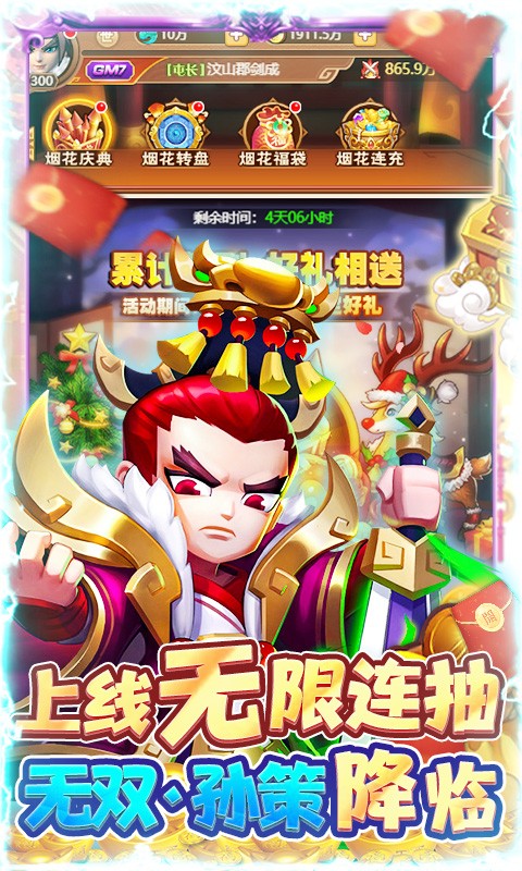 上线送金手指转盘,无限充值卡等你抽!来玩再送我是GM特权,元宝*2888888,游戏挂机也能获得现金卡,使用可激活所有充值活动。超炫萌系画风,结合卡牌体系,玩家亲临其境,将各路三国英雄收入麾下,一统三国,游戏简单容易上手,轻松滑动指尖,放置挂机养成,给您不一样的游戏体验!