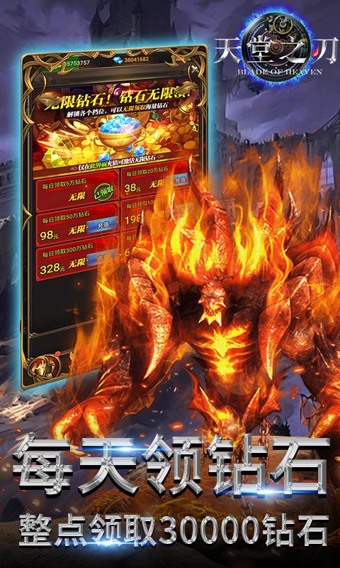 《天堂之刃(无限钻石)》上线免费领取钻石,可以无限领取,福利强势来袭,登录就送VIP60,88888钻石,铜钱*1000万,仙魔灵3种族切换,各类法宝多重变身,脚踩法轮、背装翅膀、怀抱美人。在这里你将转世到虚构的修真世界展开一段全新里程,游戏内用现代时尚的观念全新演绎神兵。