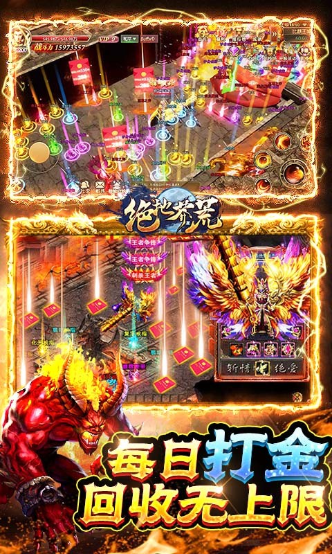 《绝地莽荒(内购破解无限充)》传奇重磅来袭,开局内购篡改,激活全部充值活动,享受无限充值的快感,领取万元顶赞,海量元宝钻石奖励。上线就是天花板!领完福利直接下地图刷怪,所有爆率地图无限制进入,玩的时间越长爆率越高,刀刀出血特效满屏!招式丰富玩法刺激,体验刺激过瘾的热血冒险,神装全靠打,装备无绑定还能自由交易~还原复古经典玩法。组队刷怪,激战BOOS,收集资源加快扫荡速度,努力角逐战场,赶快一起来玩吧!