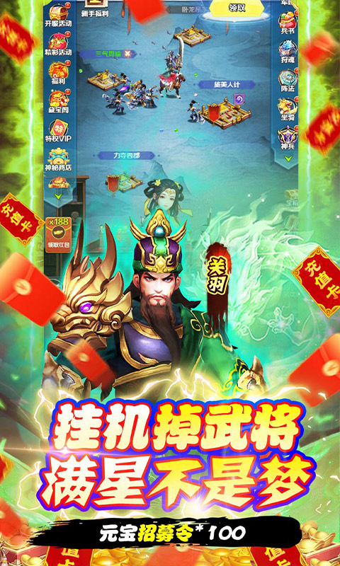 这是一款以三国题材为背景的挂机策略游戏。可让玩家身临经典的三国剧情,招募三国名将为自己所用,而玩家以君主之位发号施令、排兵布阵,与诸位乱世枭雄斗智斗勇。上百名三国武将,悉数登场,合力助您共同成就一番惊天伟业!
