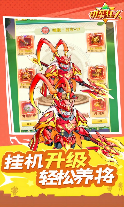 《切菜狂人》是一款Q版拟人画风的休闲放置挂机游戏,在游戏中,你是一个绝世厨神,大手一挥,你的蔬菜大军将会化身勇士,把怪物们切个精光。多重艰难险阻,注定会将你培养成一个顶尖厨神。游戏里有多种多样的蔬菜小可爱供你选择,任意搭配组合,力求为各位大厨们打造一个可以尽享酣畅战斗的蔬菜世界!