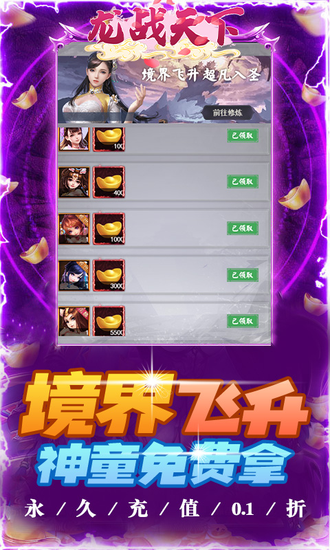 《龙战天下(0.1折现金福利)》是一款特效华丽建模精致的角色扮演类玄幻修仙游戏!用浓厚的笔墨刻画修炼成仙之路,从弱小到强大、从凡俗到惊天动地历程。神器、法宝、仙侣、侍宠、灵兽等养成助力角色睥睨群雄,幻化系统给玩家不一样的视觉体验,与众不同。多人战场、禁地首领、主宰之战、巅峰对决等特色系统养成不单调。拿着海量福利来培养你喜欢的异兽,带您体验创号即毕业的超爽体验!