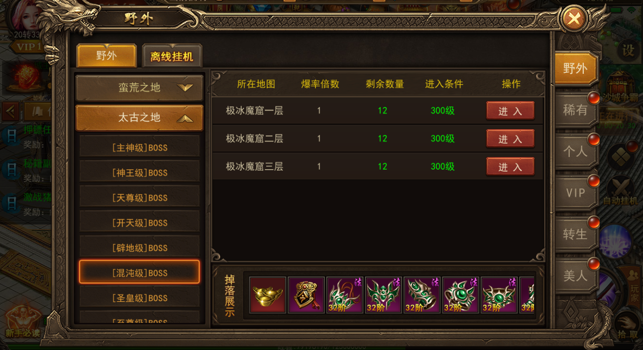 BOSS系统是玩家日常主要玩法,是装备和材料主要产出渠道,BOSS系统有普通野外BOSS、稀有BOSS、个人BOSS、VIP BOSS,转生BOSS等,进入条件以及消耗不同,主要产出不同。