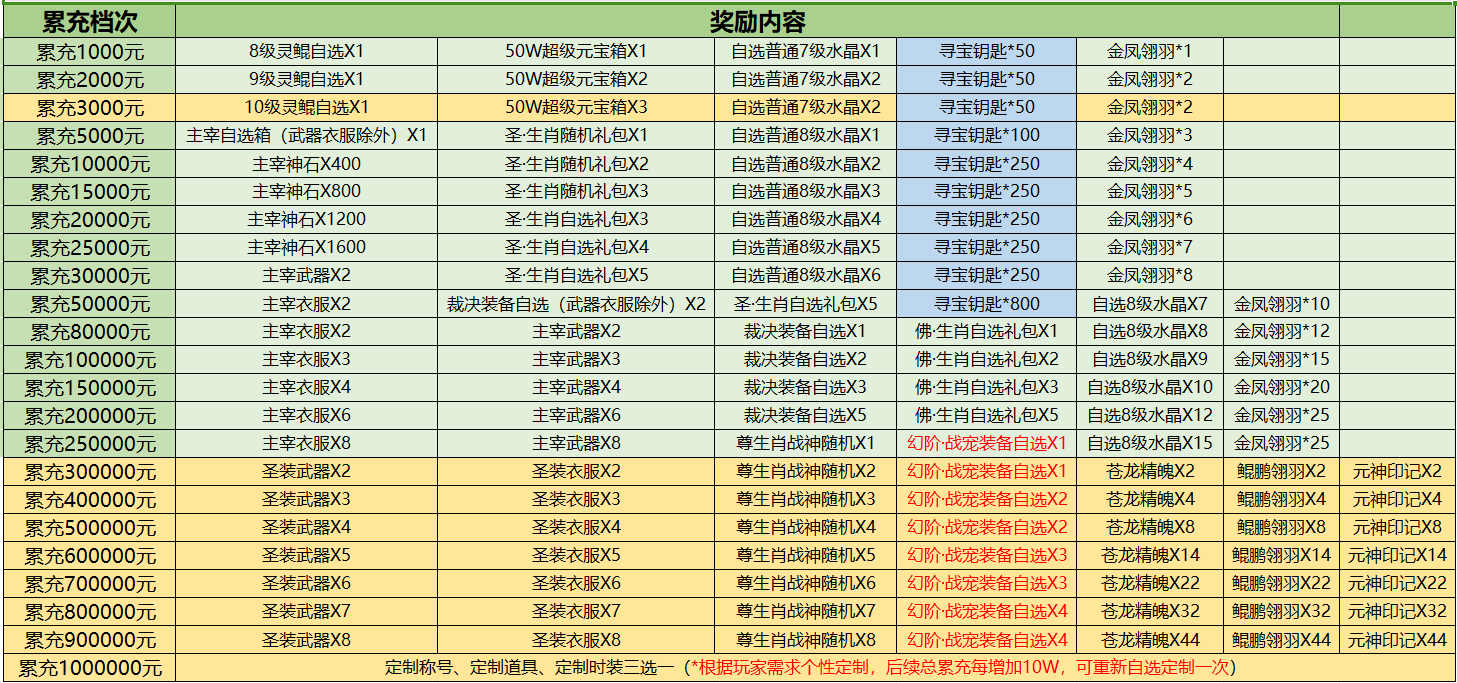 参与方式:玩家角色总充值累计达到指定金额,可获得该档位的对应奖励